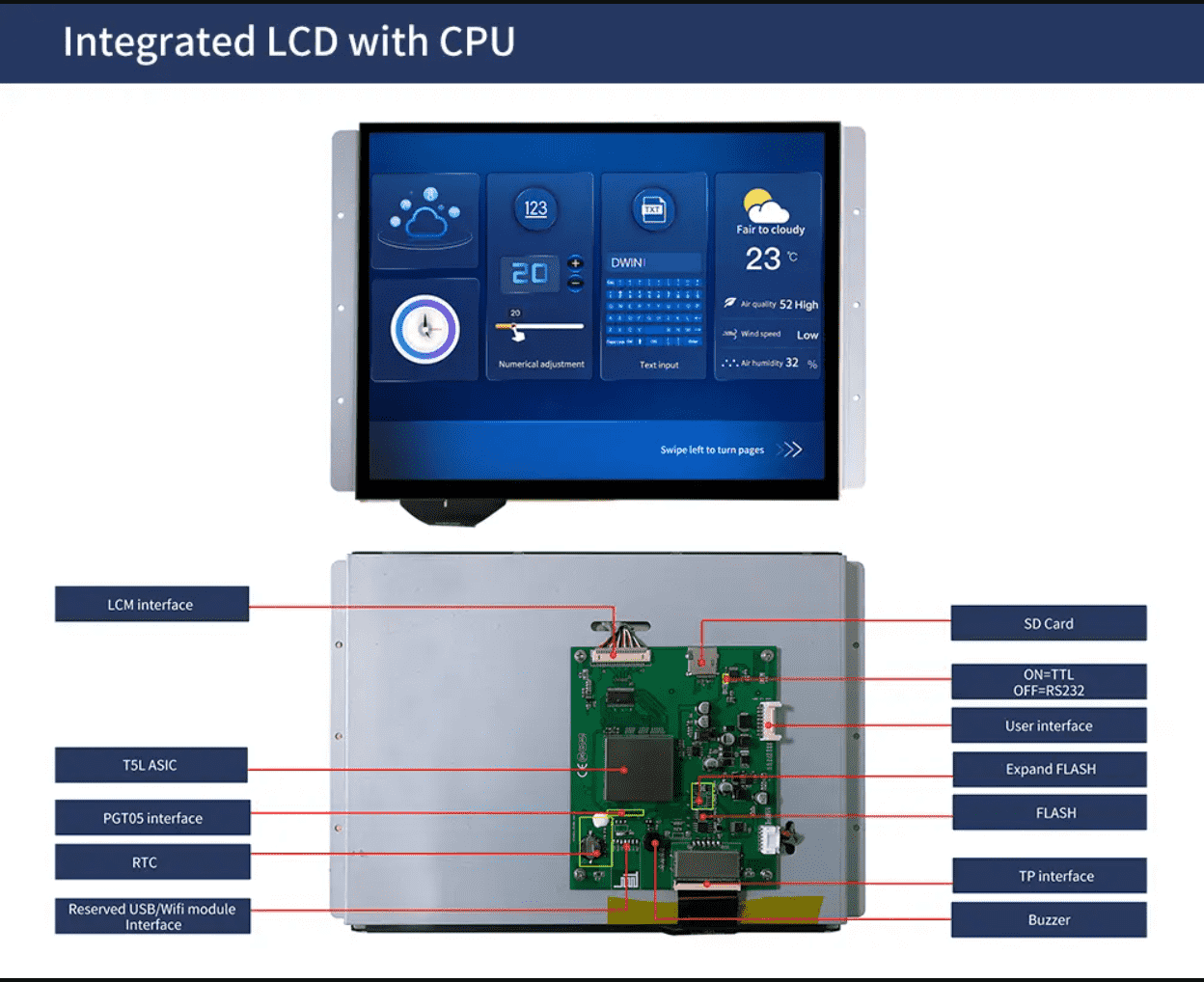 - С двухъядерным графическим интерфейсом и ОС, графический интерфейс с богатыми элементами управления. Ядро DWIN OS открыто для пользователя для второй разработки с помощью языка DWIN OS или KEIL C51.