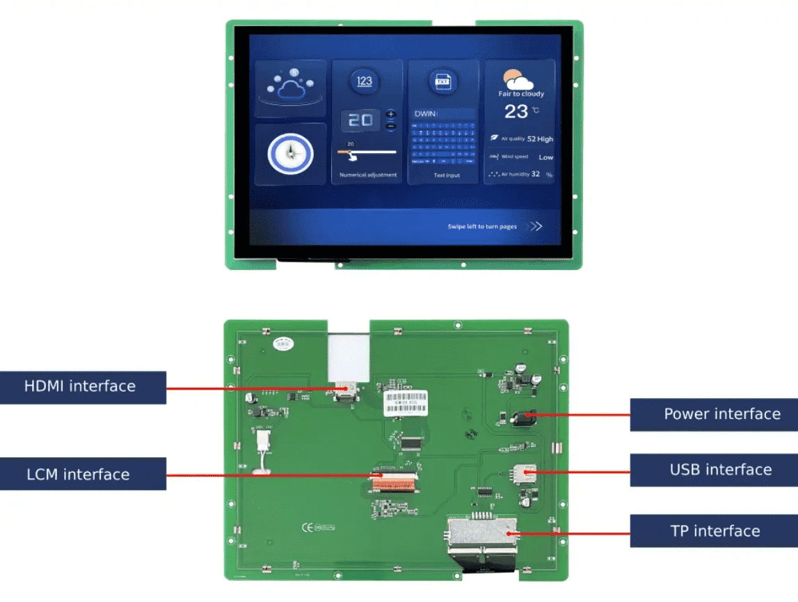 - HDW104_001L DWIN 10.4" IPS ЖК-дисплей 1024x768 с USB и HDMI интерфейсом и сенсорной ёмкостной панелью.