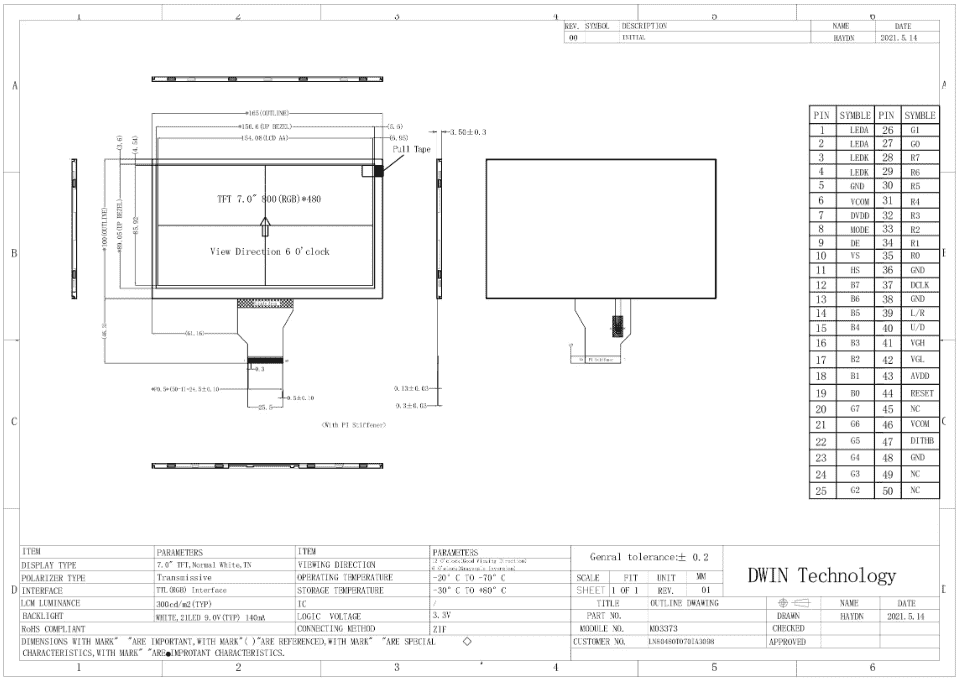 - LN80480T070IA3098 DWIN 7" 800×480 RGB 24bit 50PIN 300nit TN ЖК-дисплей.